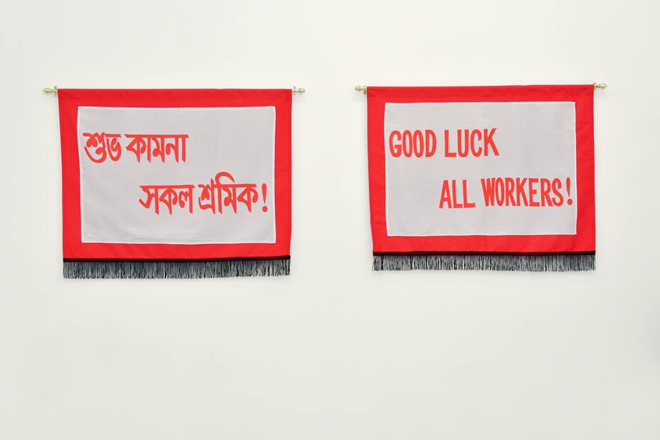 Hand-painted signs in English and Bangla on fabric banner, brass mount, 180 x 80cm approx, 2013Momentous Times commemorated the centenary of a momentous year for Irish labour activism; strikes for dock, tram, and factory workers from Belfast to Cork, Galway to Limerick, from 1907 to 1913, culminating in the Dublin Lockout.